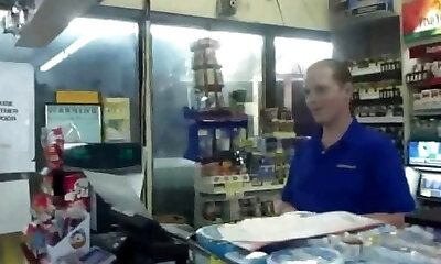 Sandy flashing and fellated by a clerk